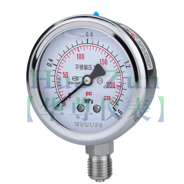 4、應(yīng)根據(jù)鍋爐工作壓力來選擇,量程刻度的極限值應(yīng)為工作壓力的1.5~3.0倍,zui好是2倍。在工業(yè)鍋爐中,實(shí)際情況是鍋爐實(shí)際運(yùn)行時的工作壓力總是比銘牌上的額定壓力要低,工業(yè)蒸汽鍋爐和熱水采暖鍋爐均是如此。例如4t/h的蒸汽鍋爐,額定壓力為1MPa,制造廠如按1.5倍來配備壓力表,應(yīng)配備1.6MPa量程壓力表。若用戶由于生產(chǎn)工藝需要,實(shí)際運(yùn)行在0.5MPa壓力下即能滿足工藝要求,這時運(yùn)行量程,壓力表的指針就指在量程的三分之一不到的位置,指針轉(zhuǎn)過角度很小.即選用的壓力表量程太大。 熱水鍋爐也是如此,例如采暖鍋爐額定壓力為0.7MPa,配備壓力表應(yīng)為1MPa或1.6MPa,如配備1MPa的壓力表,怕在水壓試驗(yàn)時使壓力表過載,于是便配備量程為1.6MPa的壓力表。實(shí)際運(yùn)行時,只要0.2MPa就能滿足采暖要求,壓力表的指針指在量程八分之一的位置,很難使人相信壓力表的準(zhǔn)確性和靈敏性。